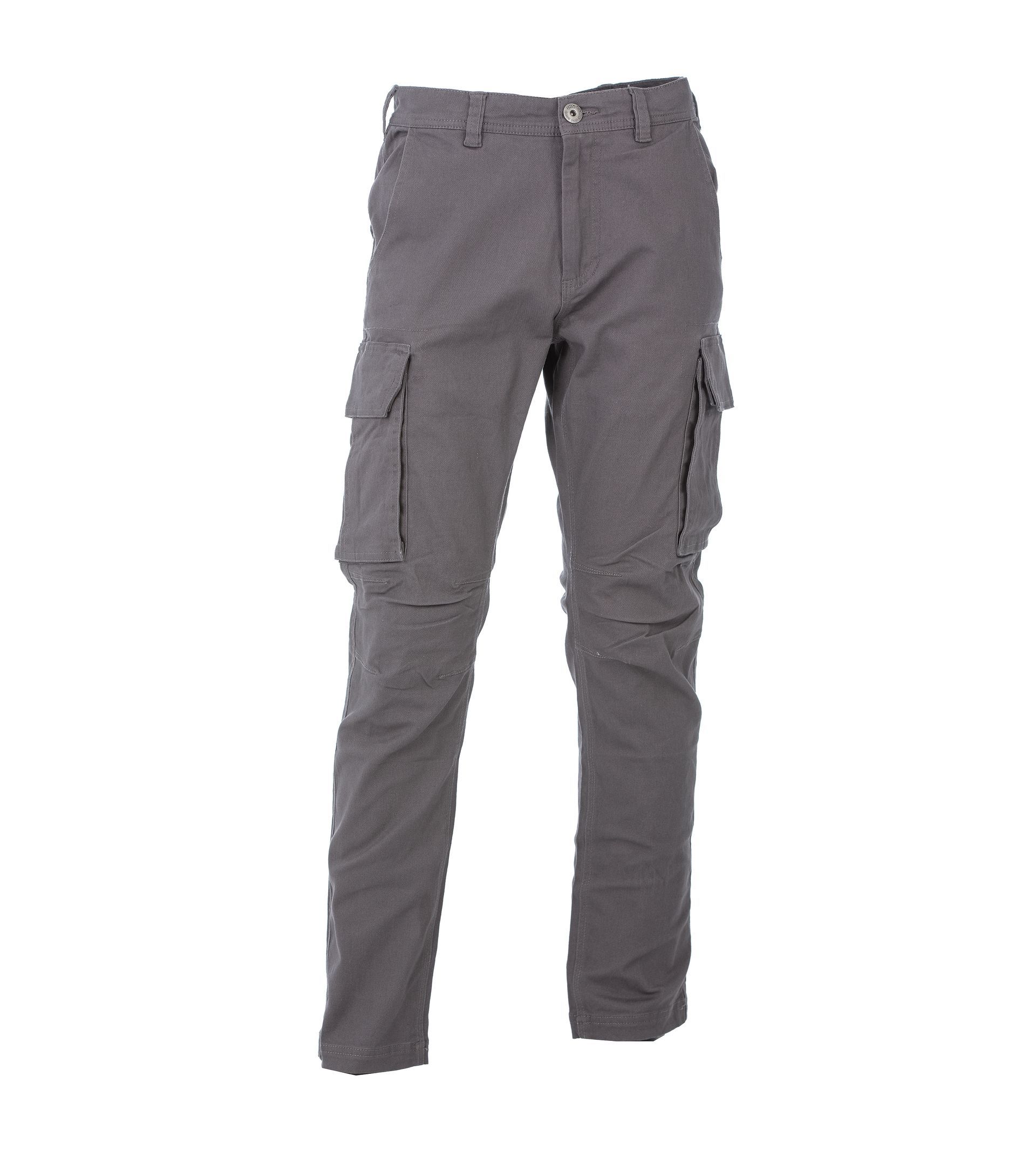Pantalone multitasche elasticizzato 98% cotone – 2% elastan. Tessuto prelavato. Elastici in vita sui fianchi. Due tasche anteriori e due tasche laterali con bottoni.